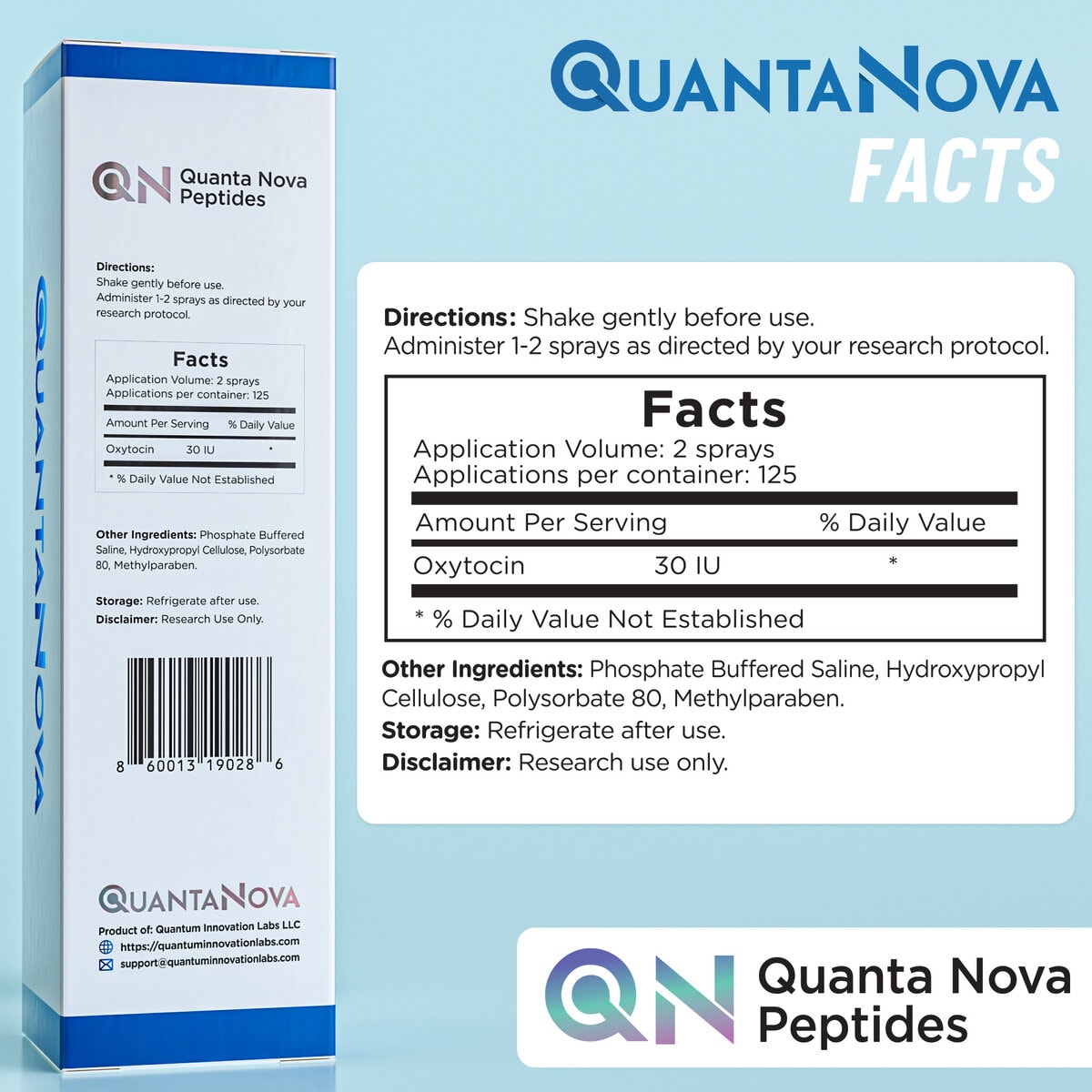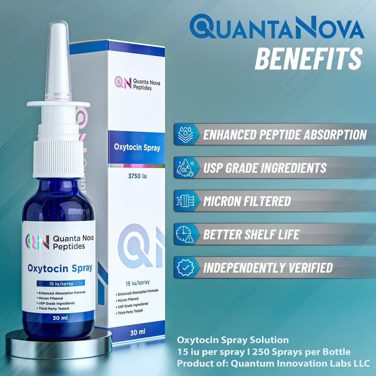 QuantaNova™ Oxytocin Spray is supplied as a 30 mL sterile solution, formulated using USP-grade ingredients for clarity, consistency, and controlled stability. Each bottle provides approximately 250 metered sprays, each containing 15 IU of Oxytocin, for precise, uniform dispensing.